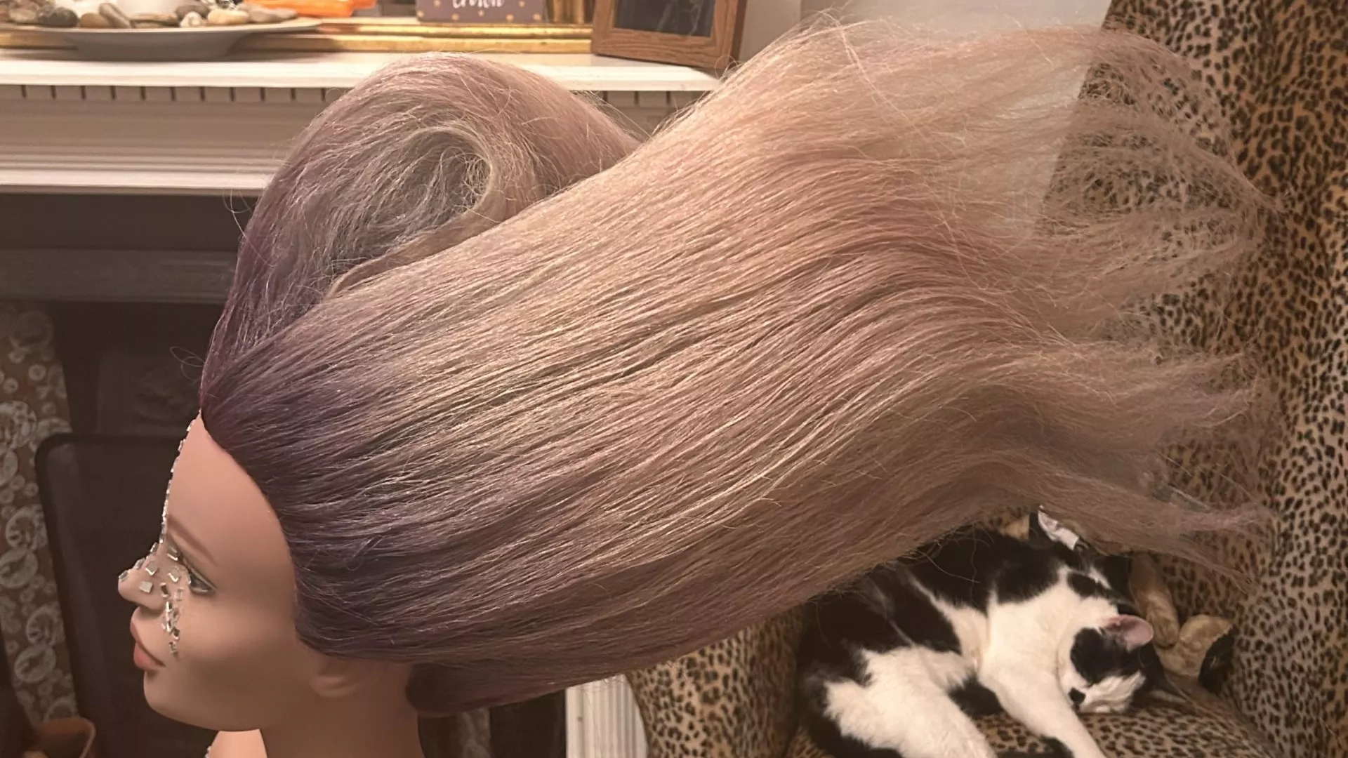 Vicki has dedicated three decades to the art of Avant Garde hair, a passion that has earned her numerous awards and recognition as last year’s International Finalist. To achieve this stunning look, Vicki expertly combined various mediums, emphasizing the crucial role of a solid foundation. She meticulously constructed a stable base using a blend of wires and padding, allowing her to build the hair like a towering structure for added height and width. Due to the mannequin head’s hair not being long enough, she creatively incorporated extra hair extensions to perfect the final result.