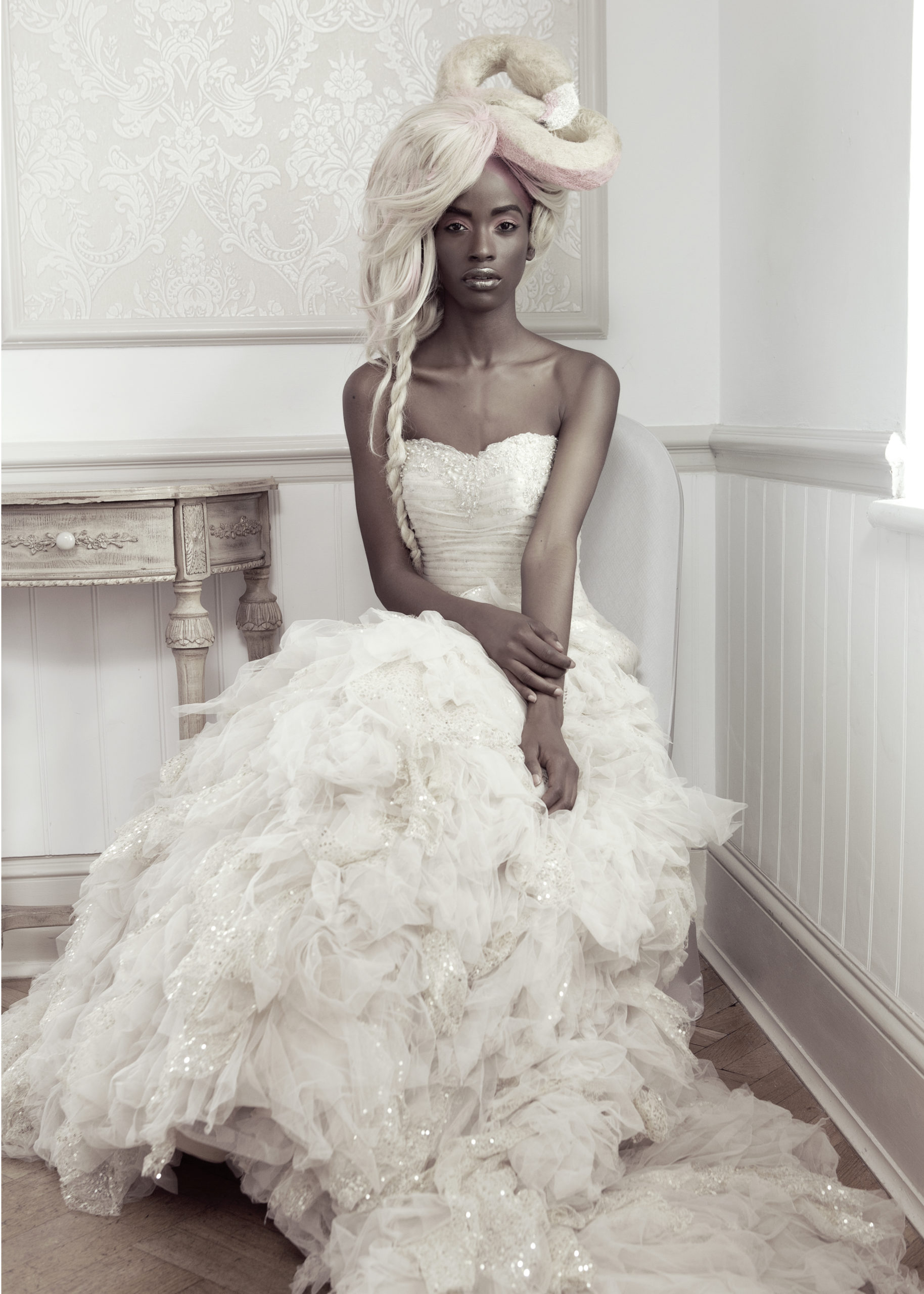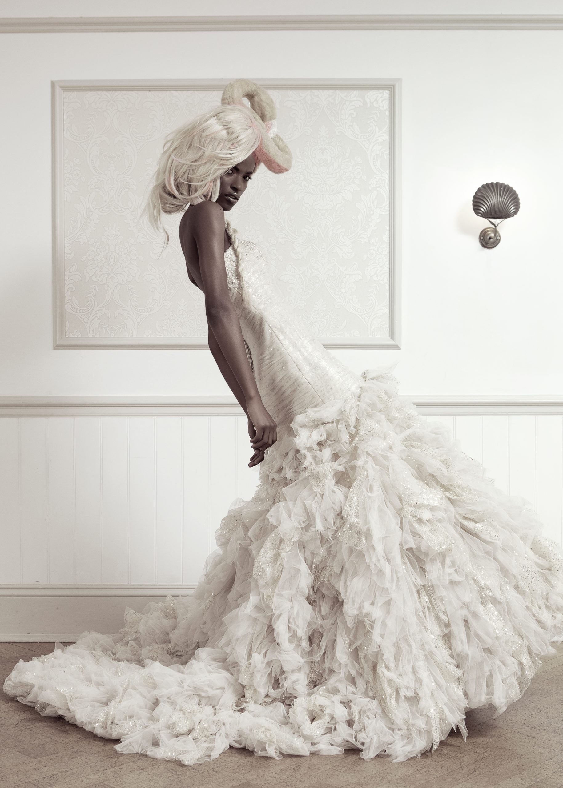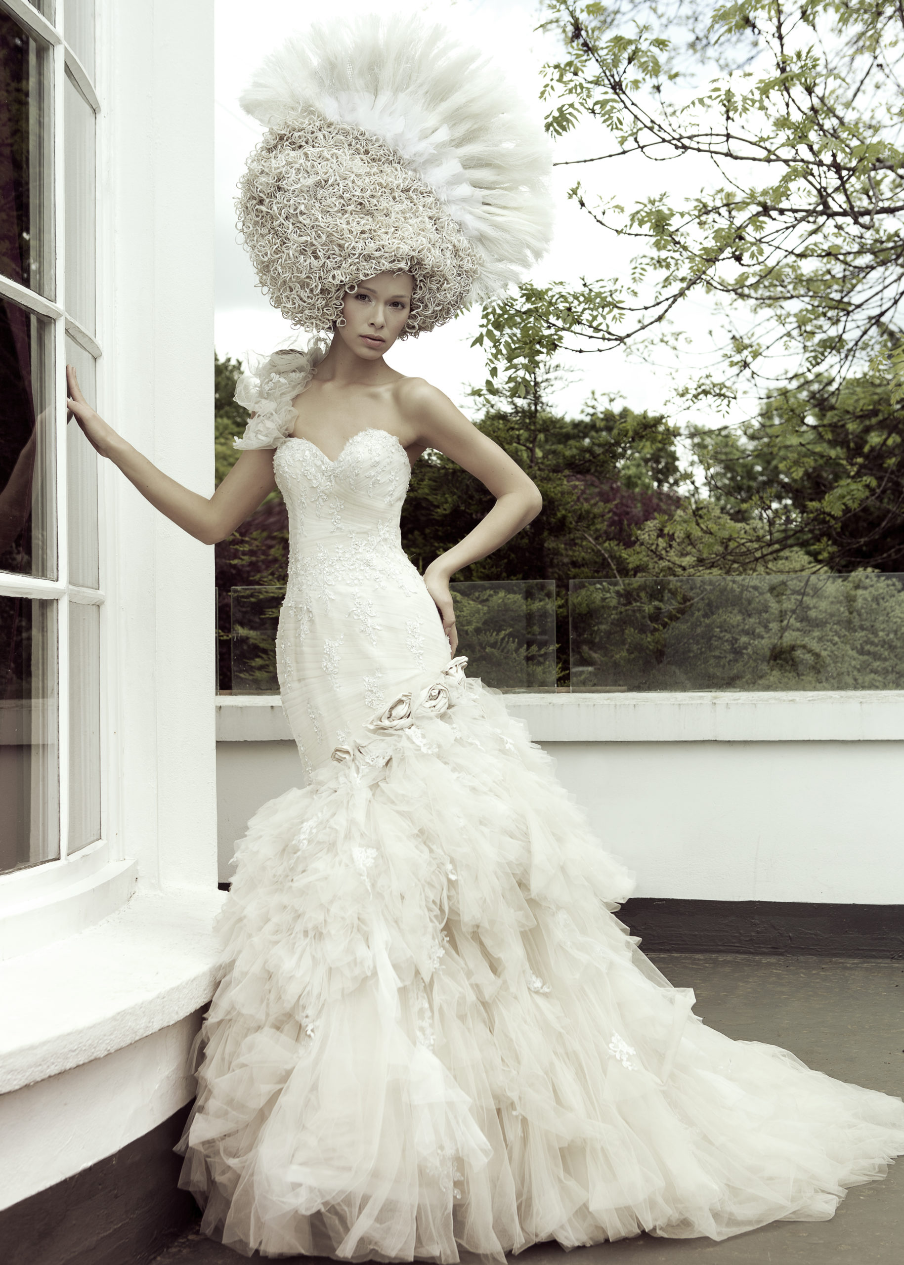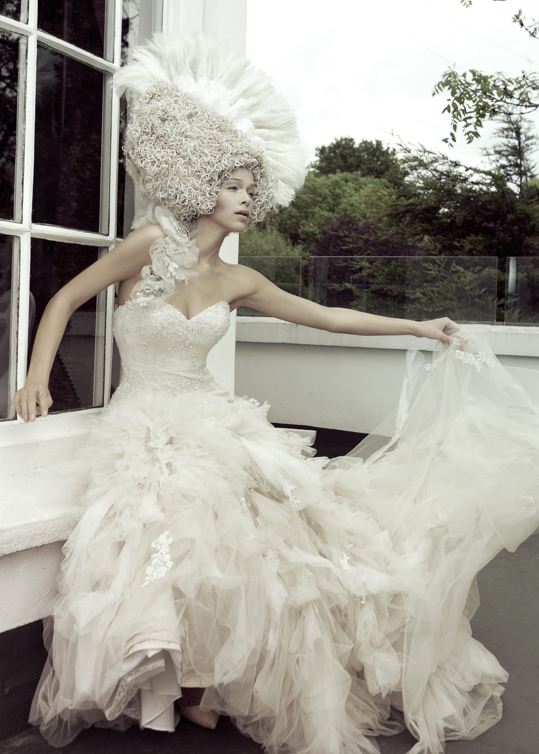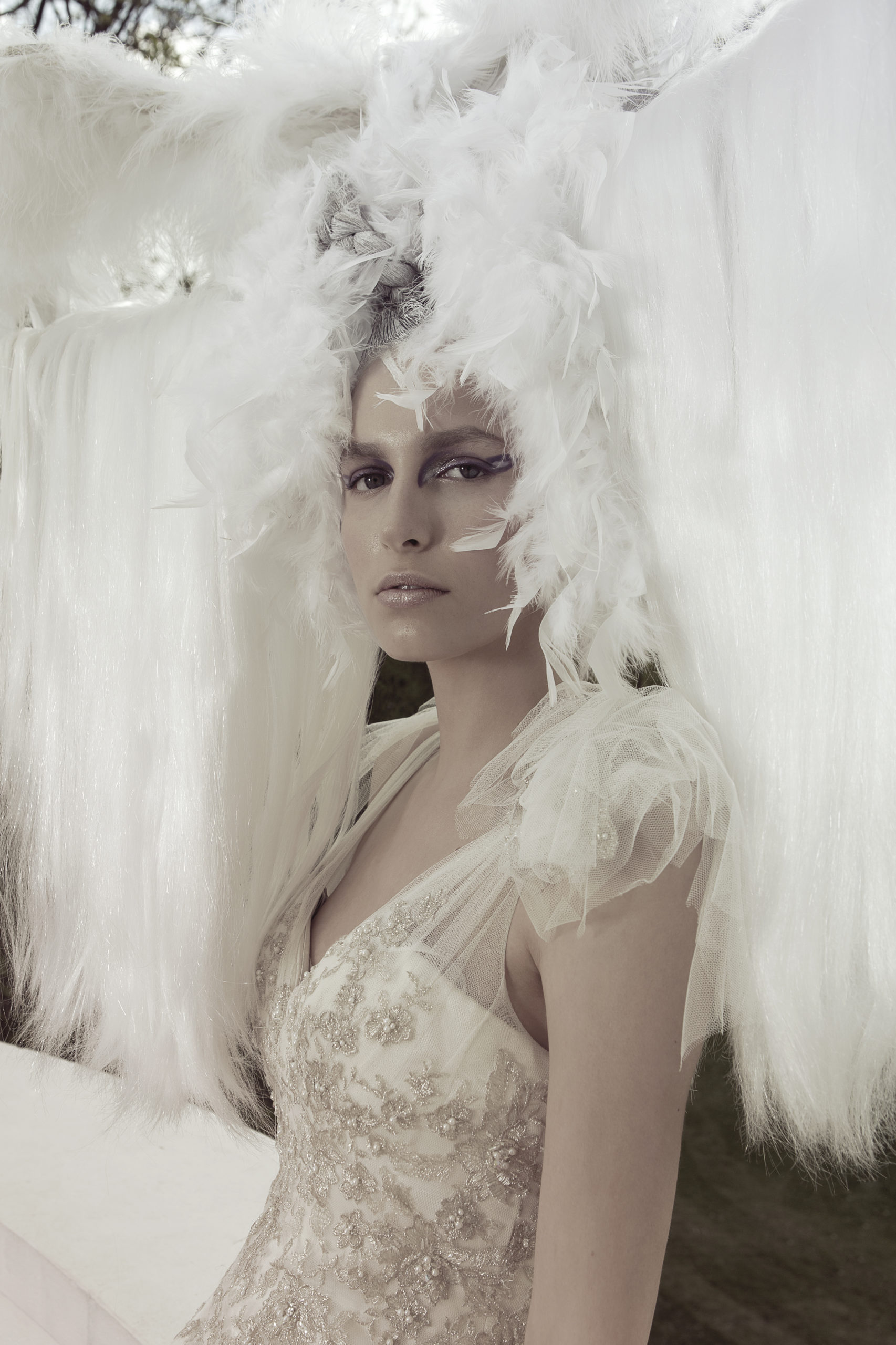 A modern, fashionista bride is a woman that embraces the traditions of marriage, along with the importance of romance and commitment, but holds onto her freedom, so she can spread her beautiful wings and still be the independent person she has always been, whilst flying side-by-side with her life partner… Multi-award winning bridal hairdresser, Vicki Lord studied the flamboyant Ian Stuart dress designs to help her create four beautiful bridal looks inspired by birds, nature and by avant-garde fashion.